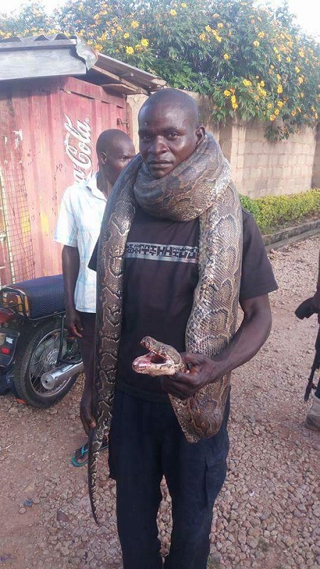 A very dangerous python snake was killed by a local farmer in the coal city of Jos yesterday with the man bravely wrapping the creepy animal around his neck and moving around on the street presumably in search of a buyer.
